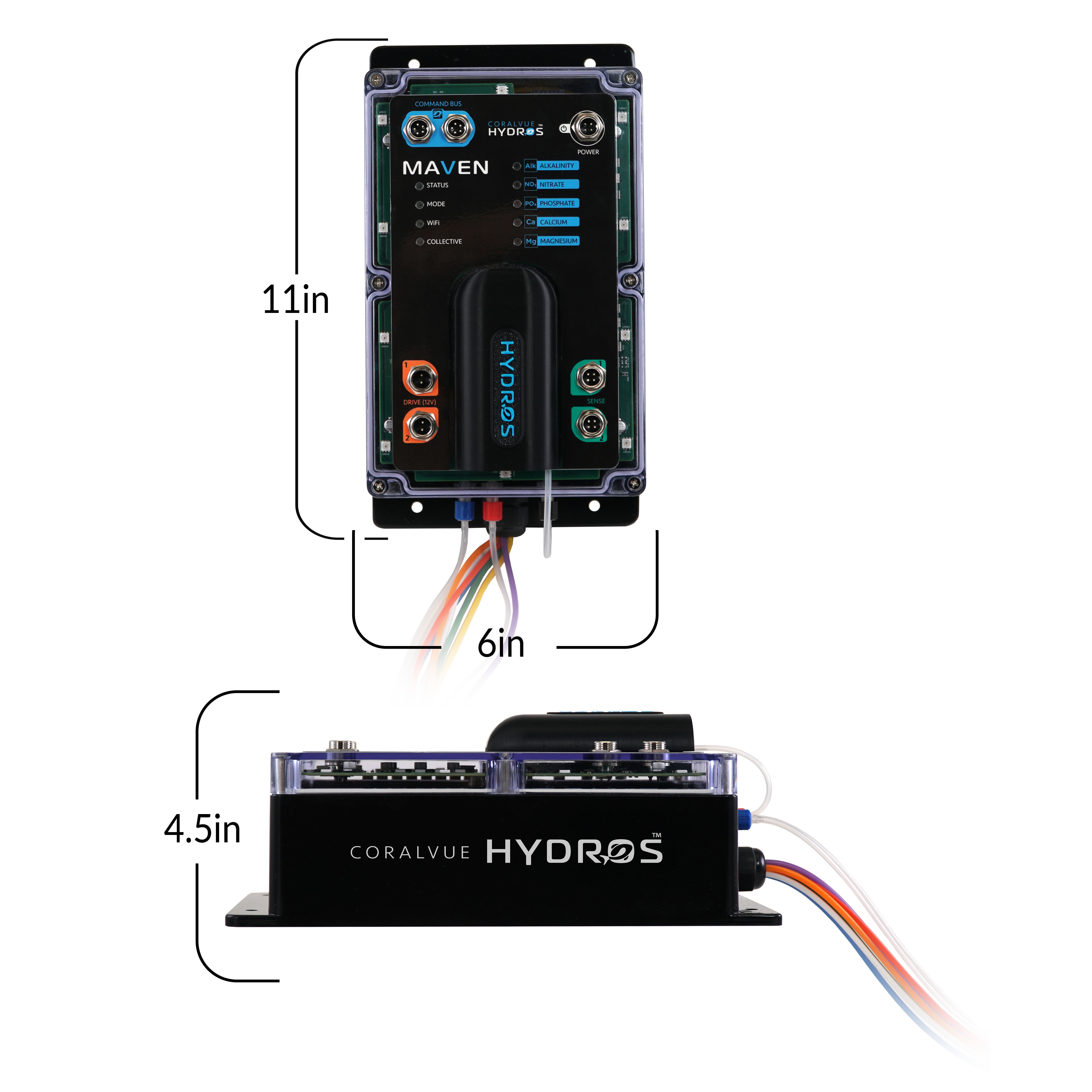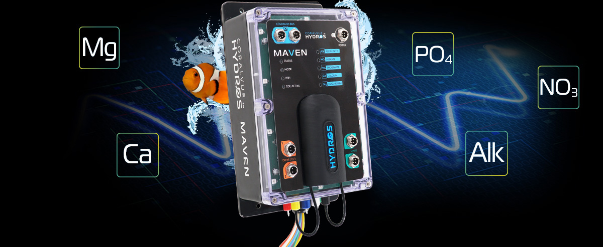 The HYDROS Maven is a sophisticated tool designed for saltwater aquariums that can automatically test water parameters. This device works independently, freeing users from the need to perform regular water testing, and provides greater accuracy in the process. Additionally, the Maven contributes to aquarium stability by continuously monitoring the water parameters, making it easy to manage dynamic dosing schedules and other parameters using the HYDROS System. The HYDROS Maven can automatically test Alkalinity (dKH), Nitrate (NO3), Phosphate (PO4), Calcium (Ca), and Magnesium (Mg).